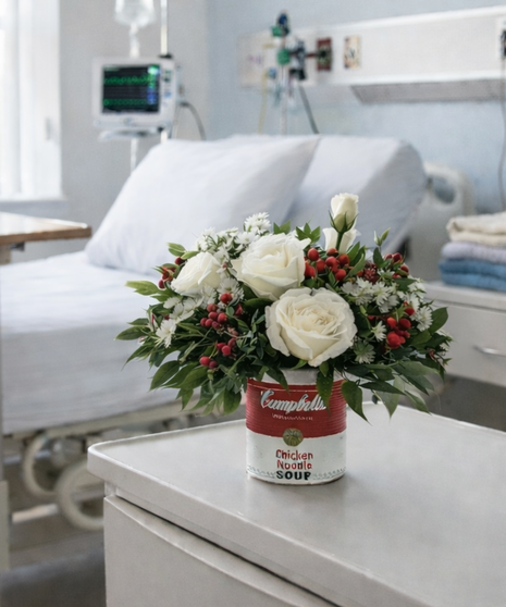 Warm, thoughtful, and full of heart, A Cup of Comfort is designed to bring reassurance when it’s needed most. Creamy white roses are paired with a delicate white lisianthus bud, soft greenery, and subtle texture, all arranged in a classic Campbell’s® Chicken Noodle Soup can. This comforting floral keepsake delivers a gentle reminder of care, hope, and healing—perfect for get-well wishes, recovery moments, or simply letting someone know you’re thinking of them.
