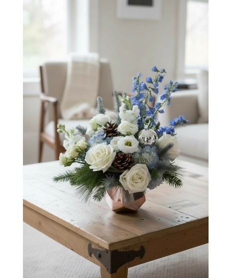 Bring effortless winter elegance into any space with Arctic Frost, a serene blend of icy blues, crisp whites, and natural textures. Lush white roses and lisianthus mingle with soft blue delphinium and hydrangea, accented by frosted evergreens, silver ornaments, and rustic pinecones. Designed in a modern faceted vase, this arrangement captures the quiet magic of winter—calm, chic, and beautifully giftable. Perfect for holiday gatherings, home decor, or sending a touch of peaceful seasonal beauty.