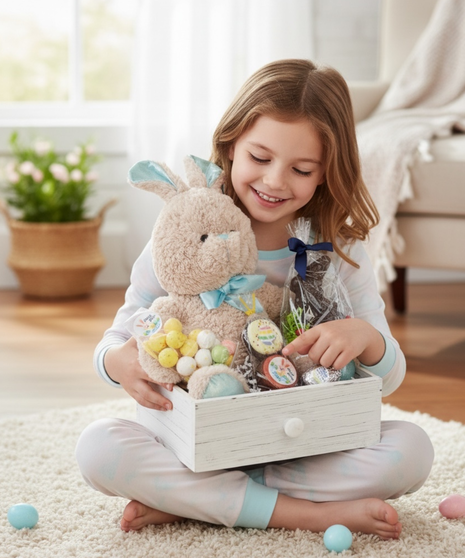 A whimsical blend of cuddly companionship and delectable indulgence, perfect for celebrating the joyous season of Easter. Nestled within a charming wicker basket, you'll find a plush bunny eagerly awaiting a new friend to share the festivities with.