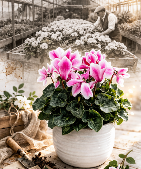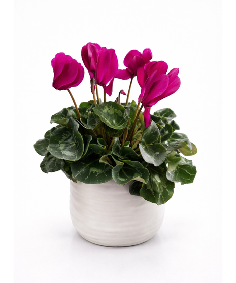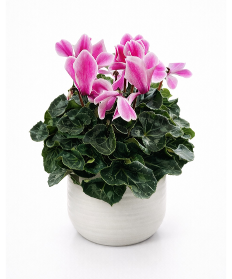 This elegant cyclamen, designed in a modern ceramic container, features graceful blooms rising above rich green foliage—symbolizing resilience, growth, and enduring beauty.