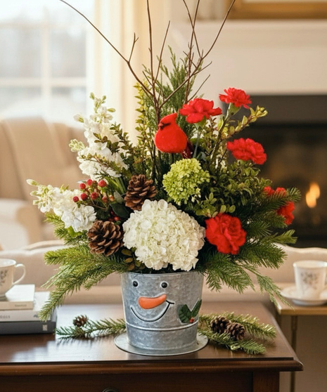 Celebrate the season with our charming Frosty’s Winter Wonderland Arrangement! Designed in a delightful snowman bucket, this whimsical piece is brimming with festive cheer. Elegant white hydrangeas take center stage, surrounded by cheerful red carnations, vibrant green accents, and lush seasonal evergreens. The arrangement is adorned with playful red berries, pinecones, and a bright cardinal for a touch of nature-inspired beauty.