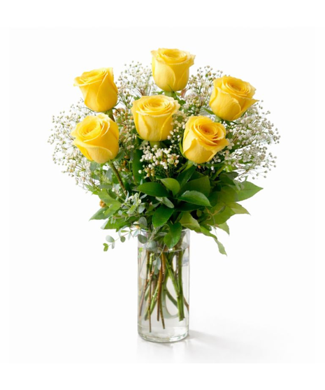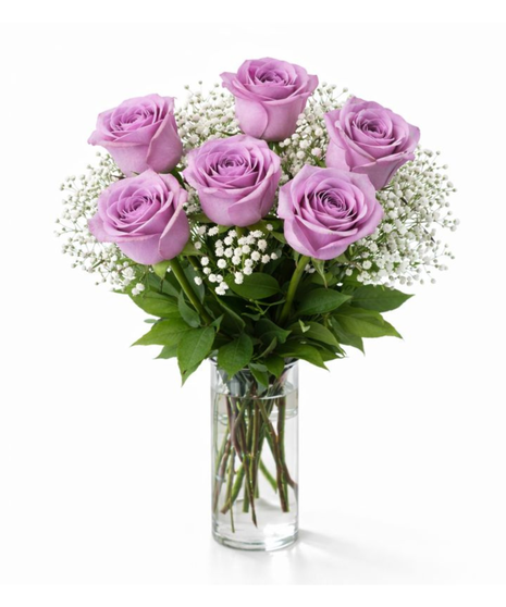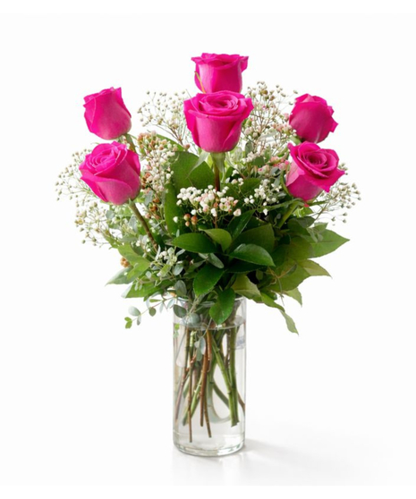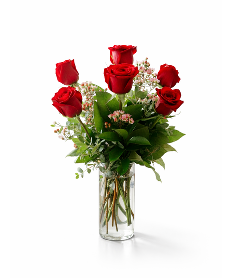 This classic Valentine’s Day arrangement features a half dozen premium red roses, artfully arranged with fresh seasonal greenery and delicate accent blooms, all presented in a clear glass vase. Elegant, romantic, and endlessly meaningful, this bouquet is perfect for expressing love, admiration, or a heartfelt “I’m thinking of you.”