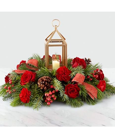 Bring your guests together with an elegant centerpiece worth gathering around. A stunning collection of roses, hypericum berries, carnations and Christmas greens sit around a matte golden lantern with a festive ribbon accent. Our I'll Be Home for Christmas Centerpiece helps light up every celebration this season.*Note: While the ribbon in your arrangement may change due to availability, we can promise the centerpiece will be fresh, bright and perfect for the holidays.