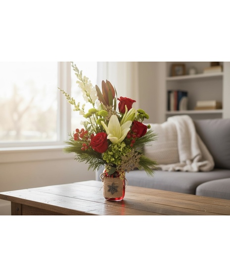 Bring a burst of holiday cheer to any space with our Jolly Jarful — a joyful mix of classic Christmas blooms designed to brighten the season. Rich red roses, snowy white lilies, crisp snapdragons, green hydrangea, and festive berries are arranged with lush evergreens for that unmistakable holiday magic. Finished in a charming rustic jar wrapped in burlap and a little tree accent, this design delivers cozy Christmas vibes in the sweetest way.