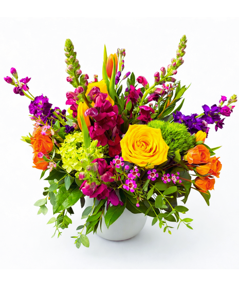 Bright. Bold. Unapologetically happy. Joy Bomb is an explosion of vibrant color—sunny yellow roses, fiery orange blooms, hot pinks, purples, and fresh greenery—designed to instantly lift the mood. Modern, playful, and bursting with personality, this arrangement delivers joy on impact.