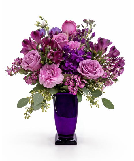 Indulge in rich, romantic tones with Lavender Luxe — a sophisticated arrangement featuring premium lavender roses, vibrant purple blooms, soft pink accents, and lush greenery, all artfully designed in a striking deep violet glass vase.