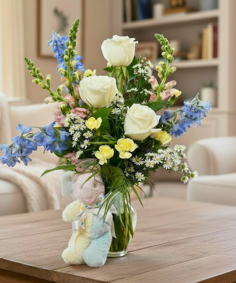 Soft as a lullaby and sweet as a hug, Little Snuggles is the perfect way to welcome life’s newest blessing. This charming pastel arrangement features creamy white roses, pale yellow blooms, soft blue delphinium, and delicate pink accents — creating a serene mix of color and texture. Finished with a plush keepsake bunny, it’s a heartfelt gift that brings warmth, comfort, and love to any nursery or new parent’s home.