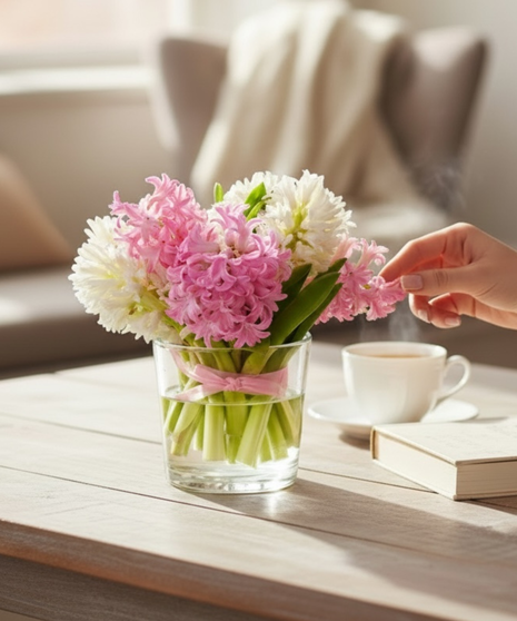 Celebrate the beauty of spring with our Milwaukee Spring Hyacinth arrangement. Featuring lush pink and white hyacinths gathered in a clear glass vase, this design brings soft color, fresh texture, and a naturally sweet fragrance into any space. The blooms are styled to feel full yet organic, creating an effortlessly elegant look that’s perfect for gifting or brightening your home. A seasonal favorite, this arrangement captures the essence of spring in Milwaukee.