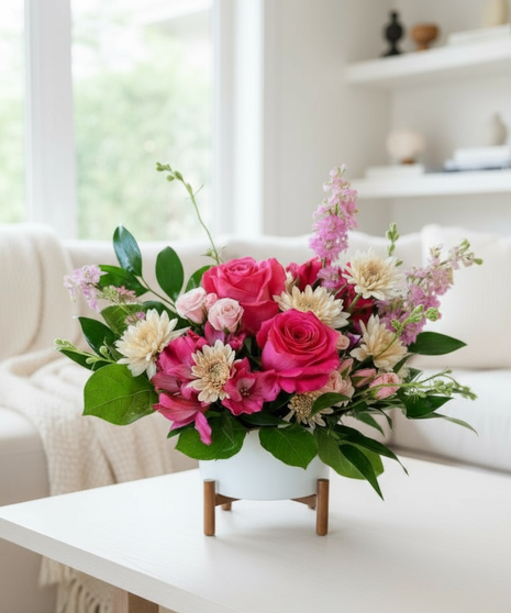 Bright, cheerful, and effortlessly elegant — Modern Mood celebrates the simple joy of fresh flowers. Bursting with vibrant fuchsia roses, blush blooms, and creamy accents, this modern garden-style arrangement brings warmth and sophistication to any space. Designed in a sleek white pot with natural wood legs, it’s the perfect mix of chic and charming — ideal for birthdays, thank-yous, or just because.