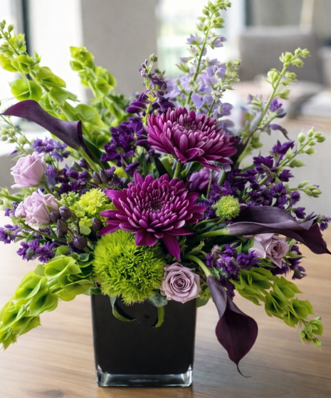 Moody Meadow is a modern, artful arrangement inspired by untamed beauty and rich, layered color. Deep plum blooms, soft lavender accents, and vibrant chartreuse textures are gathered with sculptural greenery and designed in a sleek black cube vase. Organic yet intentional, this piece feels like a quiet walk through a twilight meadow — bold, thoughtful, and effortlessly cool.