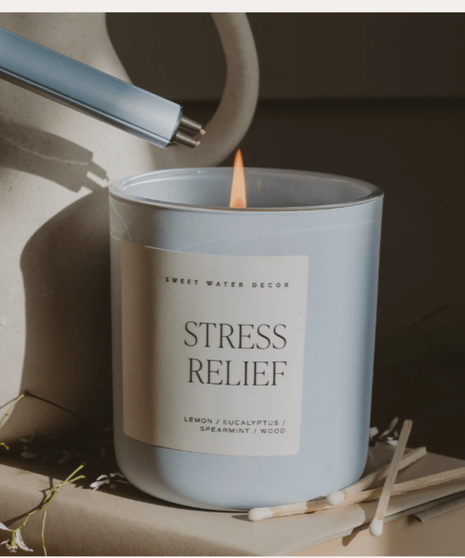 Our Stress Relief candle is an invigorating yet relaxing scent. The top notes of lemon and orange keep it bright and fresh while the eucalyptus and spearmint balance it out to be calming as well. It's the perfect scent for living rooms, bathrooms, offices and everywhere in between! Light this spa candle for yourself or give it as a gift for somebody who deserves to relax.