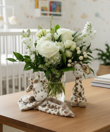 Welcome the newest little explorer with Sweet Safari — a darling mix of soft white roses, stock, and hydrangea accented with lush greenery. Paired with a cuddly giraffe plush and blanket, this arrangement brings gentle joy to any nursery. Thoughtful, gender-neutral, and full of love, it’s the perfect way to celebrate life’s wildest adventure — a brand-new baby.