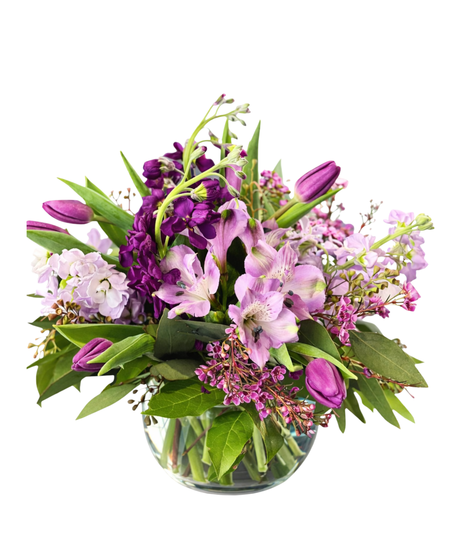 Violet Hour is your floral moment of magic—where moody purples meet blushy pinks in a dreamy swirl of texture and style. Designed in a modern glass bubble vase, this lush arrangement features tulips, alstroemeria, lilac, waxflower, and other seasonal favorites in deep berry and soft lavender tones.