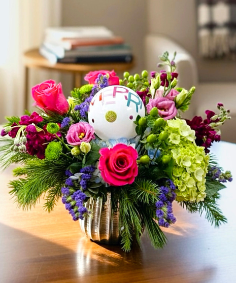 Winter Color Rush is a vibrant celebration of the season—where bold color meets fresh winter texture. Hot pink roses, lush green hydrangea, rich evergreens, and playful purple accents surround a festive ornament centerpiece, all styled in a sleek metallic ribbed vase. This arrangement is made for those who love their holidays bright, modern, and full of personality.