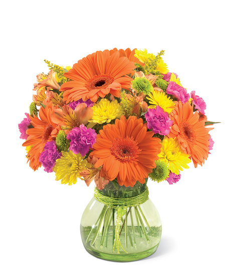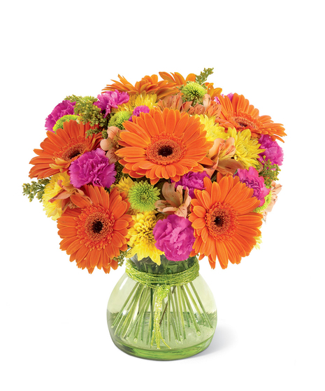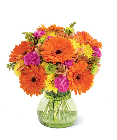 Pick a day - any day - to tell someone how special they are to you. Send them this exuberant, brightly colored bouquet of orange Gerbera daisies, yellow poms, hot pink mini carnations and vivid green button poms in a sleek, beaded green glass vase. Guaranteed to bring a smile!