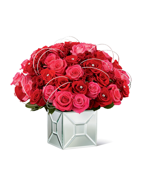 Designed to capture the heart, this bouquet goes above and beyond to create a space where modern style and love's every wish unite. Hot pink roses, red roses, and red spray roses are arranged to perfection and embellished with sparkling stone accents at the center of select blooms, as well as, silver wires to create a fascinating looping effect, taking the average rose bouquet to a new level of sophistication. Tying everything together is the modern mirrored vase that brings light and love to this unique design. GOOD bouquet includes 41 stems with vase. Approx. 15"H x 15"W. BETTER bouquet includes 53 stems with vase. Approx. 16"H x 16"W.