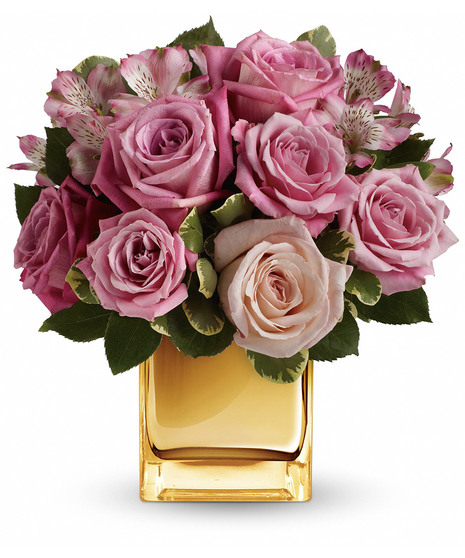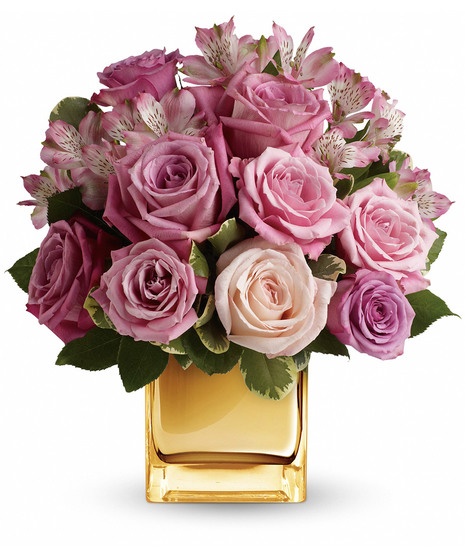 Ravishing roses and a radiant cube vase combine to stunning effect in this amazing arrangement featuring soft, romantic shades of pink and lavender. It's sure to make her heart radiate with love and affection!